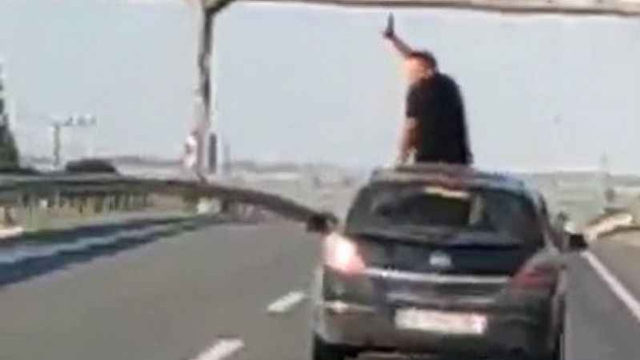 Edirne’nin Keşan ilçesinde otoyolda seyir halinde bulunan bir otomobilin sunroof camından çıkarak, dakikalarca yolculuk eden bir şahıs adeta canını hiçe saydı. Diğer araçlara da el sallayarak, selamlayan trafik magandası,...