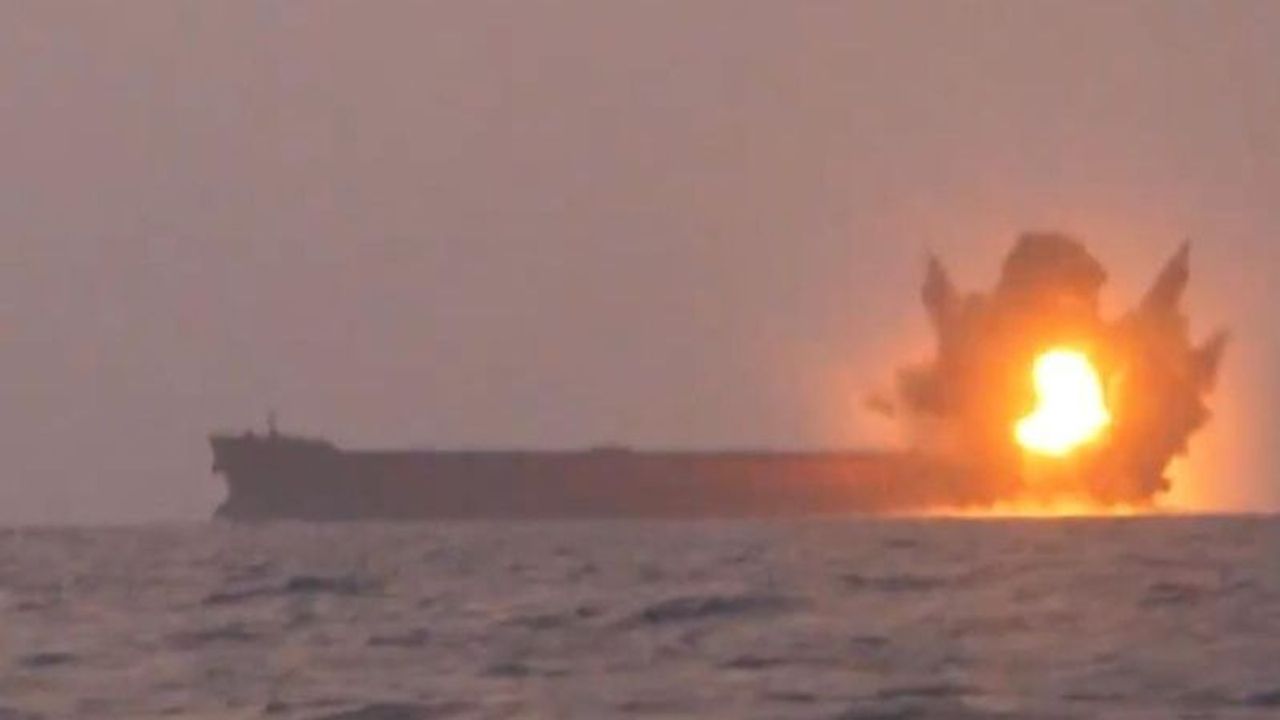 Görüntülerde geminin silahlı muhafızlarının "Şahpad"e yönelik yoğun ateşine rağmen kamikaze botunun hedefi...