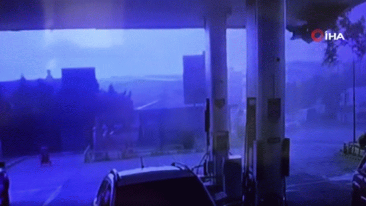 Esenyurt Hadımköy yolunda şiddetli sağanak öncesi kısa süreli hortum paniği yaşandı. Bir benzin istasyonunun kamerasına yansıyan güvenlik kamerası görüntülerinde panik anları yer aldı.