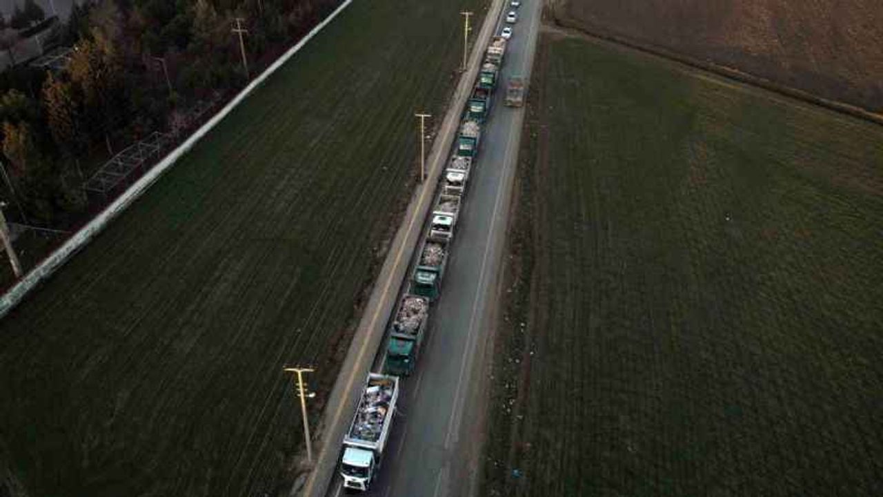 Kahramanmaraş’ta yıkılan binaların enkazını taşıyan hafriyat kamyonları metrelerce kuyruk oluşturdu. Gün içerisinde defalarca sefer yapan kamyonların oluşturduğu yoğunluk, dron ile havadan görüntülend