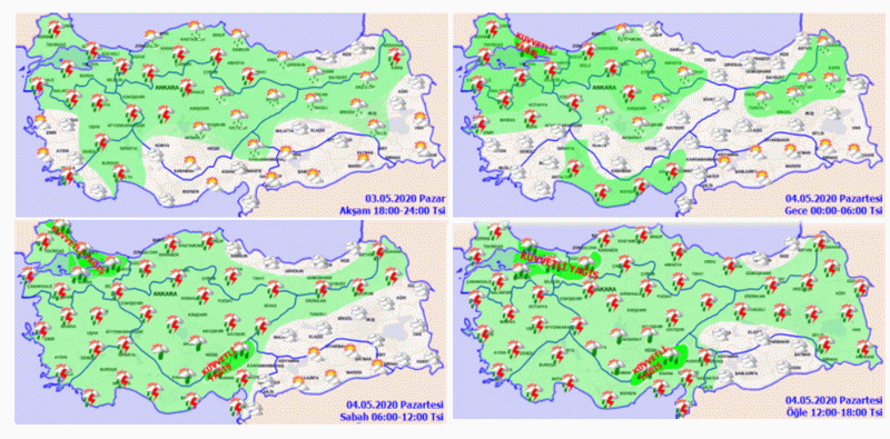 Sağanak yağışların bu gece İstanbul'da ve gün içerisinde Marmara'nın kuzey ve doğusunda kalan iller (İstanbul, Kırklareli, Kocaeli, Sakarya, Bursa ve Yalova) ile Bolu, Adana ve Mersin'in iç kesimleri, Osmaniye'nin kuzeyi ve Kahramanmaraş'ın batısında yerel olarak kuvvetli (21-50 Kg/m2) olması bekleniyor.