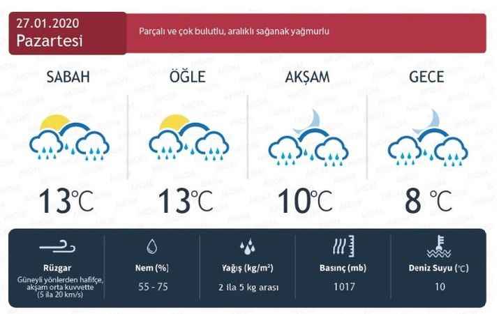 - Antalya: Parçalı ve çok bulutlu, öğle saatlerinden sonra kıyı kesimleri sağanak yağışlı 17