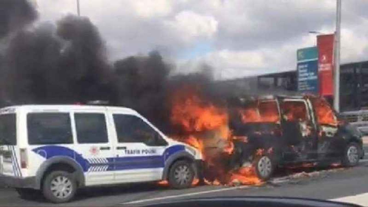 Olay saat 10.30 sıralarında İstanbul Havalimanı girişinde, giden yolcu terminaline giden yolda meydana geldi. Edinilen bilgiye göre havaalimanına yolcu getiren Beser Kuzu'nun kullandığı, 59 TR 600 plakalı VIP minibüs yanmaya...