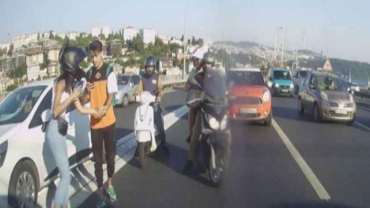 İstanbul 15 Temmuz Şehitler Köprüsü Beşiktaş sapağında bir motosikletli çift, araçta küçük kızı olan bir sürücüyle tartışarak saldırıda bulundu. O anlar araç kamerasına yansıdı.
