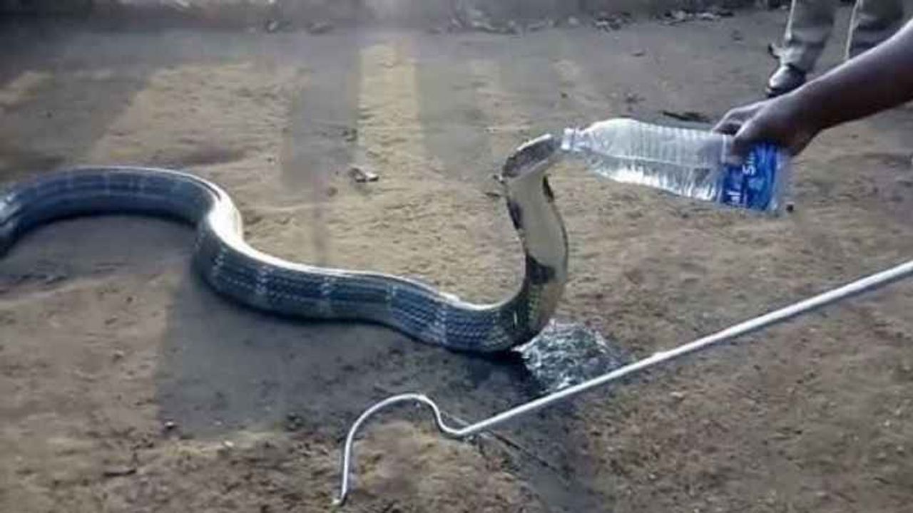 Hindistan‘da kaydedilen görüntülerde, bir kurtarma ekibi kobraya pet şişeden su içiriyor. Bölgedeki kuraklık nedeniyle vahşi hayvanların ciddi şekilde etkilendiğini söyleyen yetkililer kobraya cesurca şişeden su içirdi.
