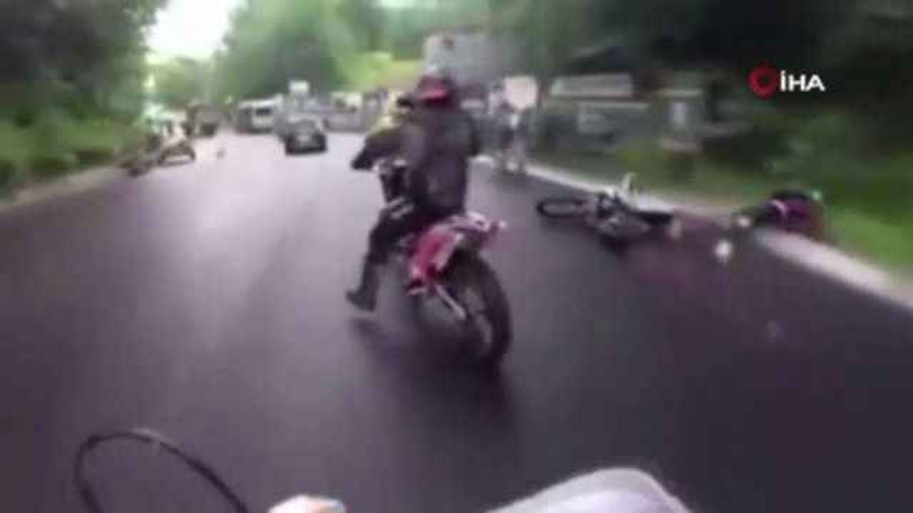Ukrayna'da seyir halindeki motosiklet grubundan biri kontrolünü kaybederek önündeki sürücüye çarptı. Dengesini kaybeden sürücü sürüklenirken motosiklet ise ata çarptı.