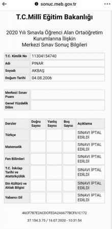 Bugün açıklanan LGS sonucunda Pınar Akbaş’ın sonucu “sınavı iptal edildi” şeklinde açıklandı. Sınavda cevap kağıdı kaybolan Pınar Akbaş, “Tüm arkadaşlarımın sınav sonucu açıklandı benimki açıklanmadı. Sınavım iptal edilmiş olarak görülüyor. Yanlışım veya doğrum kaç soru olursa olsun ben sonucumu görmek isterdim. Bundan sonra ne olacak bilmiyorum. Ailem beni özel okula göndermek istiyor. Sanırım öyle olacak” dedi.