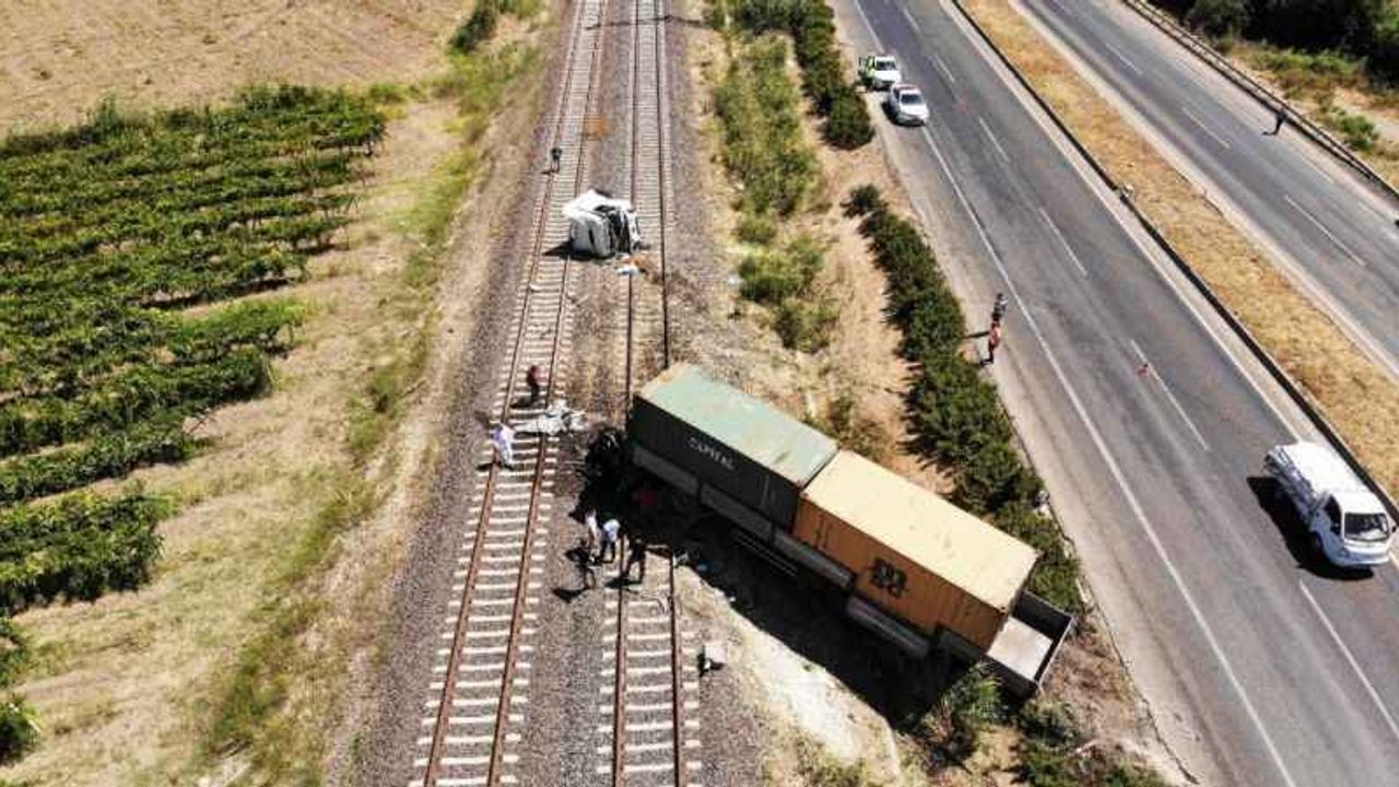 Manisa’nın Şehzadeler ilçesinde lastiği patlayan tır, sürücüsünün direksiyon hakimiyetini kaybetmesi sonucu refüjü aşarak karşı şeridin yanında bulunan tren yoluna uçtu.