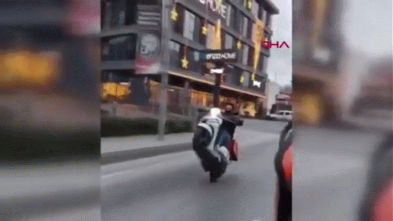 İstanbul Beyoğlu’nda bir kuryenin, ön tekerini kaldırdığı motosikletiyle tek teker üzerinde yaptığı trafikteki tehlikeli yolculuğu yine kuryelik yapan arkadaşının cep telefonu kamerasına yansıdı.