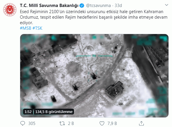MSB'den yapılan açıklamada, "Esed rejiminin 2100’ün üzerindeki unsurunu etkisiz hale getiren Kahraman Ordumuz, tespit edilen rejim hedeflerini başarılı şekilde imha etmeye devam ediyor." ifadeleri kullanıldı.