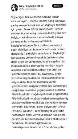 "Söylediğim her kelimenin sonuna kadar arkasındayım. Ucuzcu tacirler hariç, konuyu yanlış anlayabilecek akıl ve sağduyu sahipleri için yazılı olarak tekrar anlatıyorum. İsrail’le serbest ticaret anlaşması olan birkaç ülkeden biriyiz, Mavi Marmara zamanında da askıya alınmayan bu anlaşmayla Filistinli kardeşlerimizinde Türk malların serbestçe satın alabiliyorlar, bunun da katkısıyla ticaret dengemiz 1 e 6 bizim lehimizedir. Söylediğim kayda alma yöntemi yasak ürün listesinden daha etkin bir yöntemdir, İsrail’e yapılan tüm ihracatın kayda alınması ile her ürün kayda alınarak izin verilirken satılan her ürün ve şirkette kontrol edilir. Bu sayede şu anda yüzlerce milyon dolarlık ihale alarak onlarca milyon dolar teminat mektubu veren şirketlerimizin mağduriyetleri gibi daha birçok mağduriyetin önüne geçmiş oluruz. Onlarca Filistinli şirketin mağduriyetleri de engellenmiş olur.Söylediğim yasak liste yerine tam kontrol demektir. SözlerimiTekrar ediyorum“ DAHA HASSAS OLMAK”.