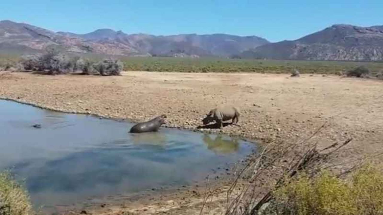 Güney Afrika'nın Küçük Karu platosundaki ulusal parkında kurak mevsim zamanı su içmeye gelen gergedana iki su aygırı saldırıyor. Kavga sonucunda su aygırlarından biri gergedanı boğup öldürüyor.