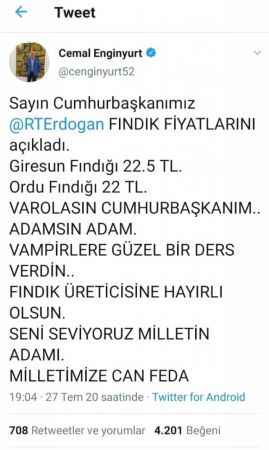 Milliyetçi Hareket Partisi (MHP) Ordu Milletvekili Cemal Enginyurt da sosyal medya paylaşımında, “Sayın Cumhurbaşkanımız Recep Tayyip Erdoğan fındık fiyatlarını açıkladı. Giresun fındığı 22.5 TL, Ordu fındığı 22 TL. Var olasın Cumhurbaşkanım, adamsın adam. Vampirlere güzel bir ders verdin. Fındık üreticisine hayırlı olsun. Seni seviyoruz milletin adamı, milletimize can feda” dedi.