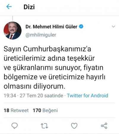 Ordu Büyükşehir Belediye Başkanı Mehmet Hilmi Güler ise, fındık fiyatlarıyla ilgili sosyal medya hesabından yaptığı paylaşımda, “Sayın Cumhurbaşkanımıza üreticilerimiz adına teşekkür ve şükranlarımı sunuyor, fiyatın bölgemize ve üreticilerimize hayırlı olmasını diliyorum” ifadelerine yer verdi.