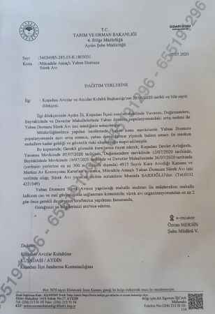 Edinilen bilgiye göre, Kuşadası’nda aç kaldıkları için şehir merkezine inen ve özellikle Ege Mahallesi ve çevresinde vatandaşlara zor anlar yaşatan domuzlar için sürek avı izni çıktı. Kuşadası Avcılar ve Atıcılar Kulübü’nün talebini inceleyen Tarım ve Orman Bakanlığı Aydın Şube Müdürlüğü 300 metre mesafeye kadar domuzlar için sürek avı izni verdi. Tarım ve Orman Bakanlığı Aydın Şube Müdür Vekili Özcan Mersin tarafından imzalanan ve Kuşadası Avcılar ve Atıcılar Kulübü ile Kuşadası Jandarma Komutanlığı’na gönderilen yazıda, “Kuşadası Avcılar ve Atıcılar Kulübü’nün başvurusu üzerine müdürlüğümüz tarafından yapılan incelemede, bahse konu olan mevkilerde yaban domuzu populasyonundaki aşırı artış sonucu, yaban domuzlarının yiyecek bulmak için meskun mahallere geldiği ve güvenlik riski oluşturduğu tespit edilmiştir. Bu kapsamda gerekli güvenlik kurallarına uyularak, Kuşadası Devlet Avlağında, Yavansu, Değirmendere, Bayraklıdede ve Davutlar Mahalleri’nde yerleşim yerlerinin en az 300 metre dışında mücadele amaçlı yaban domuzu sürek avı izni verilmiş olup, sürek avı yapacak ekibin sorumluluğuna da Mustafa Sarıoğlu getirilmiştir" denildi.