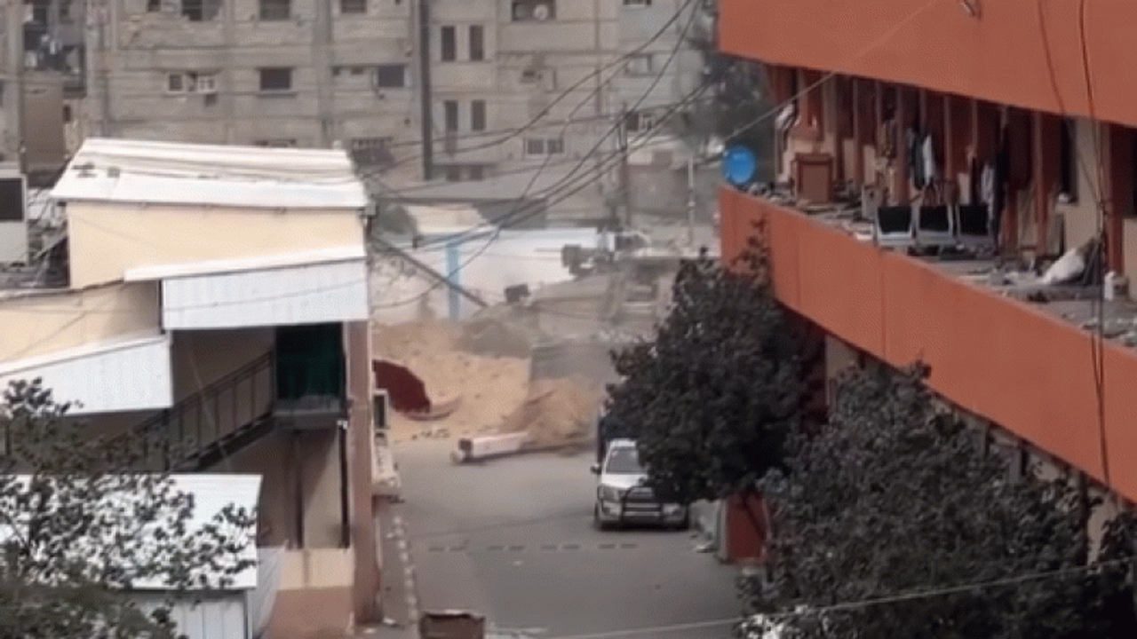 Katil İsrail rejimi ağır iş makineleri ile yıkılan girişi açarak askeri taşıtları hastaneye sokmaya çalışıyorlar