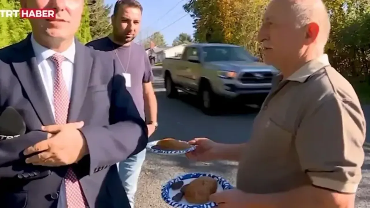 FETÖ firarileri, terörist Fethullah Gülen'in gömülme anlarından görüntü alabilmek için malikanenin dışında bekleyen TRT Haber ekibine helva uzattı.