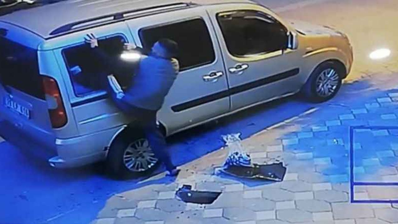 Araç sahibi sabah aracının başına geldiği zaman arka camının kırık olduğunu fark ederek çevredeki güvenlik kameralarını inceledi. Güvenlik kamerasına yansıyan olayda aracın yanına gelen genç bir süre etrafı gözetledikten sonra aracın arka camını kırarak içeriye giriyor.