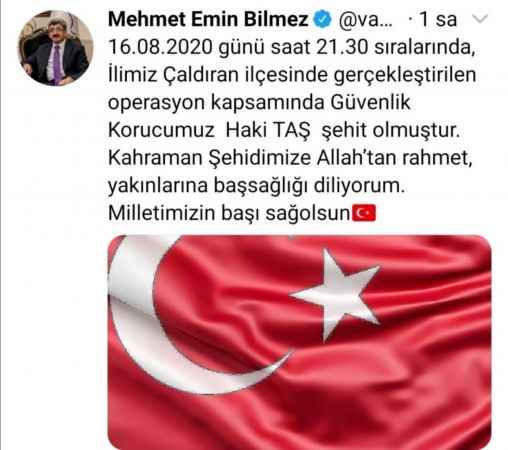 Van Valisi ve Büyükşehir Belediyem Başkan Vekili Mehmet Emin Bilmez, Çaldıran ilçesinde gerçekleştirilen operasyon sonucu 1 güvenlik korucusunun şehit olduğunu duyurdu. Vali Bilmez, acı haberi sosyal medya hesabından duyururken “16.08.2020 günü saat 21.30 sıralarında, ilimiz Çaldıran ilçesinde gerçekleştirilen operasyon kapsamında Güvenlik Korucumuz Hakkı Taş şehit olmuştur. Kahraman şehidimize Allah’tan rahmet, yakınlarına başsağlığı diliyorum. Milletimizin başı sağolsun” cümlelerine yer verdi.
