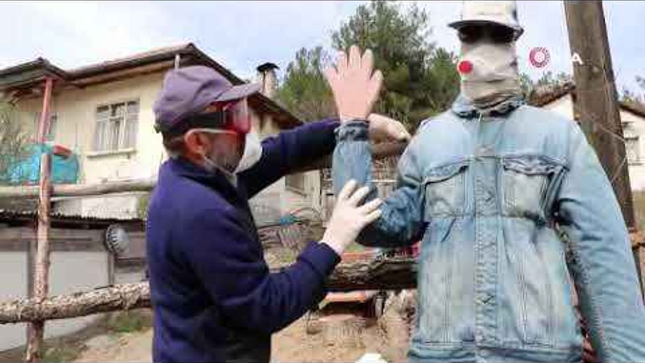 Safranbolu'ya bağlı Sarıahmetli köyünde oturan Recep Özen, risk gurubunda olması nedeniyle evine gelenleri önlemek amacıyla ilginç bir yöntem buldu.