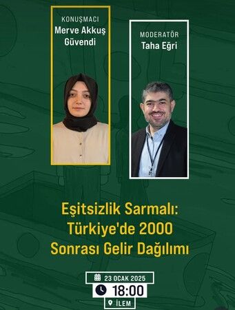 * İLEM’de (İlmi Etüdler Derneği), Taha Eğri moderatörlüğünde ve Merve Akkuş Güvendi’nin sunumuyla gerçekleşecek etkinlikte, “Eşitsizlik Sarmalı: Türkiye’de 2000 Yılı Sonrası Gelir Dağılımı” başlığıyla Türkiye’de 2000 yılı sonrası gelir dağılımı, toplumsal yapıyla ilişkili olarak ele alınacak.