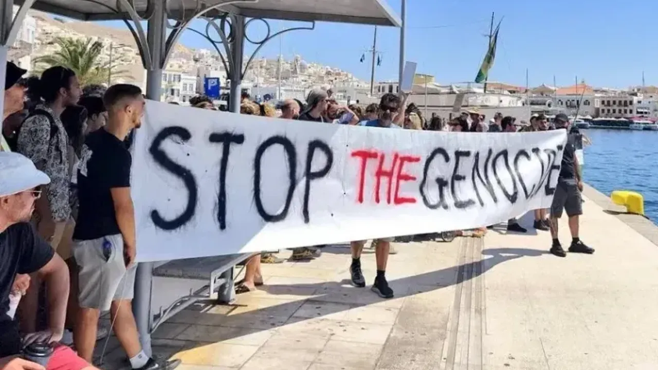 Yunanistan Komünist Partisinin (KKE) üye ve üst düzey yöneticileri, çeşitli sol gruplar, sendikalar ile Filistin yanlısı aktivistlerden oluşan kalabalık, İsrailli gemi yolcularının karaya çıkmasını engellemek amacıyla limanda toplandı. Yaklaşık 500 kişilik grup, ellerinde Filistin bayrakları ve Gazze’de hayatını kaybeden çocukların fotoğraflarını taşıdı.