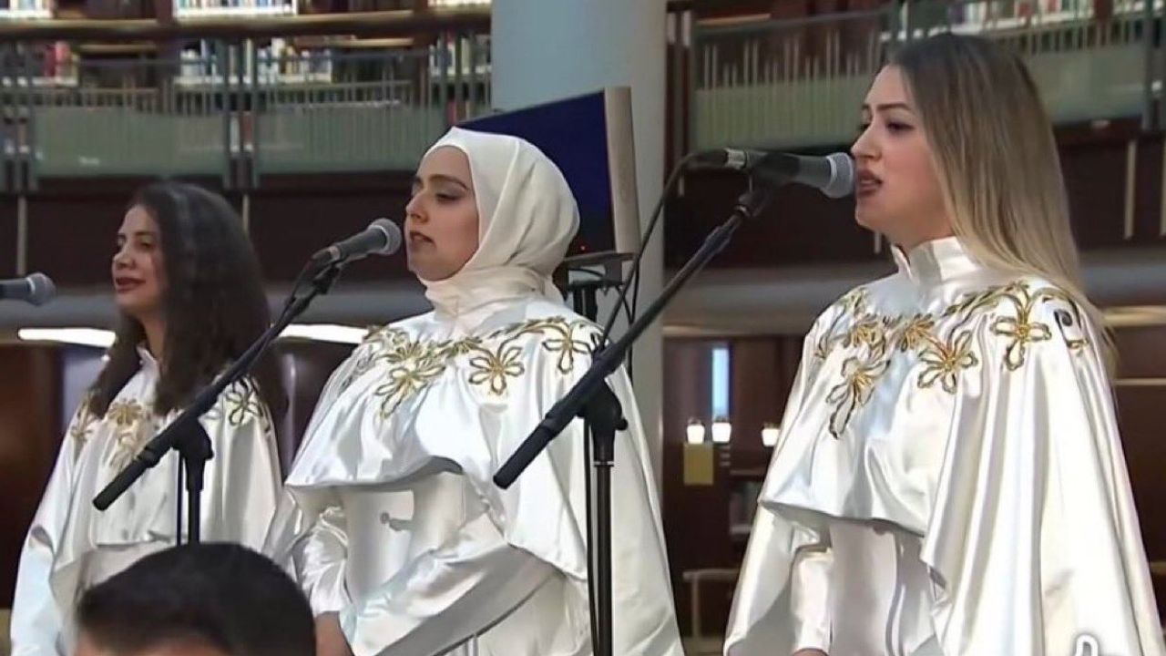Cumhurbaşkanı Recep Tayyip Erdoğan ile Papa 14. Leo, Ankara’daki resmi tören ve görüşmelerin ardından Cumhurbaşkanlığı Millet Kütüphanesi’nin Cihannüma Salonu’nda sivil toplum ve diplomatik temsilcilerle bir araya geldi. Program öncesinde salonda Türkçe ve İngilizce ilahiler seslendirildi; bu eserler arasında, İslam tarihine Hz. Peygamber’in Medine’ye gelişini karşılayan ilahi olarak geçen “Tala’al Bedru Aleyna”nın da çalınması dikkat çekti.